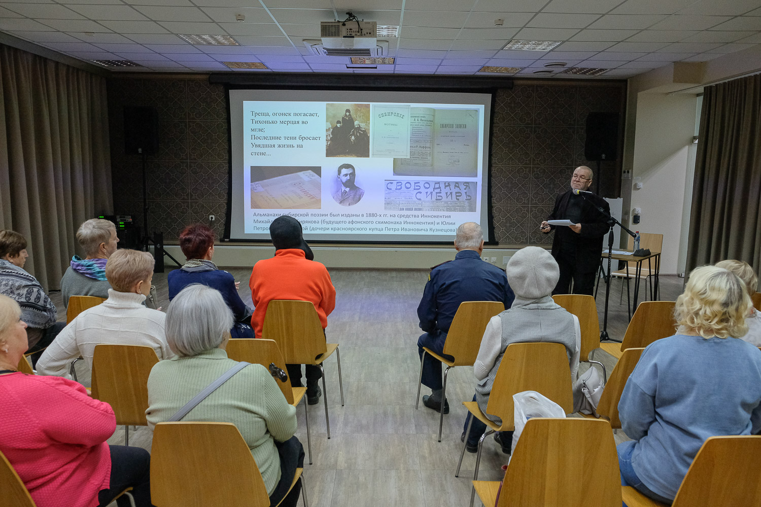 24 октября в Культурно-историческом центре «Успенский» прошла первая лекция «(Не)забытые голоса Сибири» главного хранителя Красноярского регионального общественного фонда развития духовной культуры «Касьяновский дом», члена Союза писателей России Геннадия Малашина. Мероприятие, как и одноименный проект «Касьяновского дома», посвящено судьбам поэтов и поэзии на берегах Енисея XIX-XXI веков.