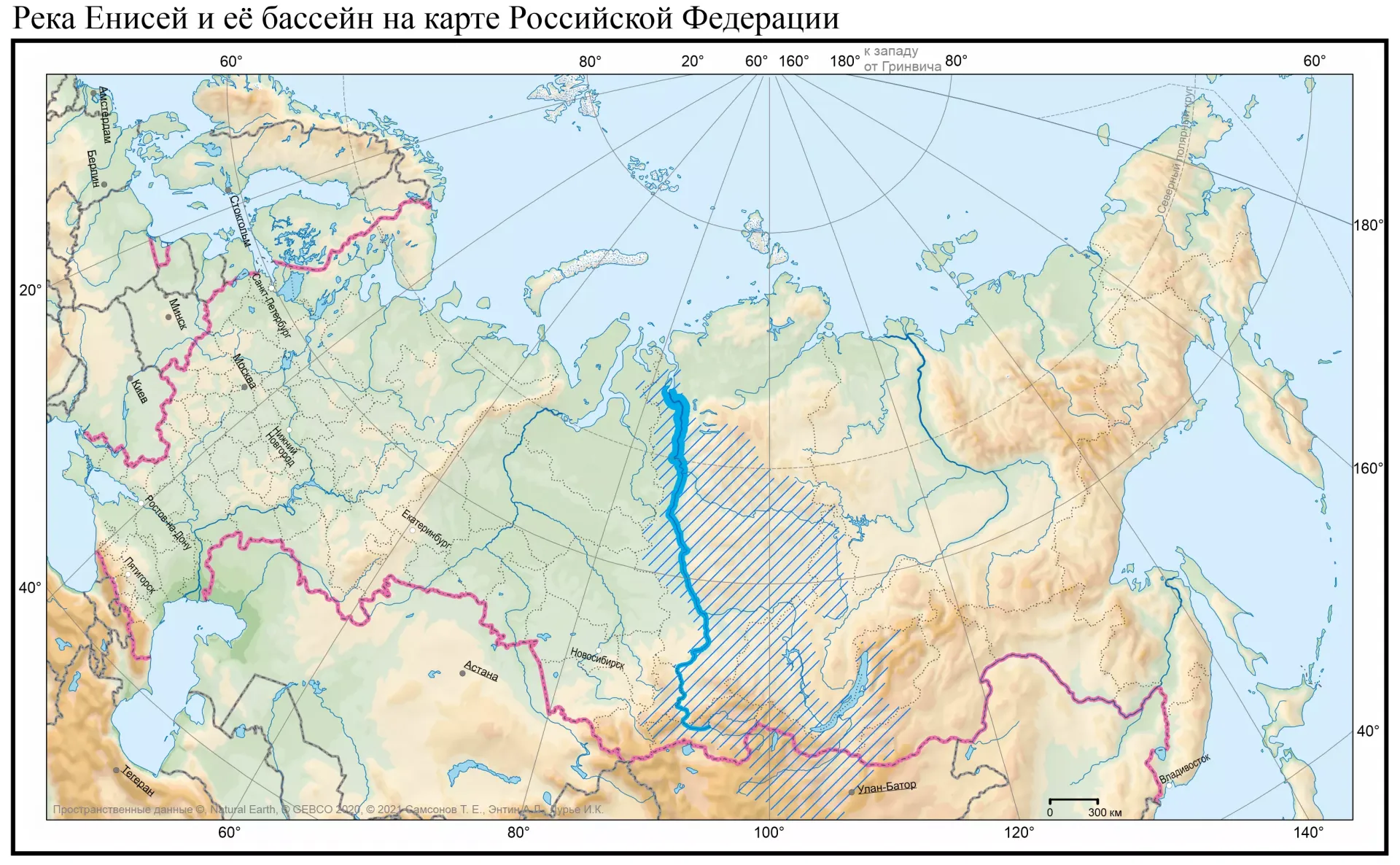 Протекая с юга на север, Енисей служит естественной границей между Западной и Восточной Сибирью и проходит через все климатические зоны. Уникальность реки в том, что в ее верховьях можно встретить верблюдов, а в низовьях — белых медведей. Место слияния Большого и Малого Енисеев у города Кызыла считается географическим центром Азии, что отмечено специальным обелиском.